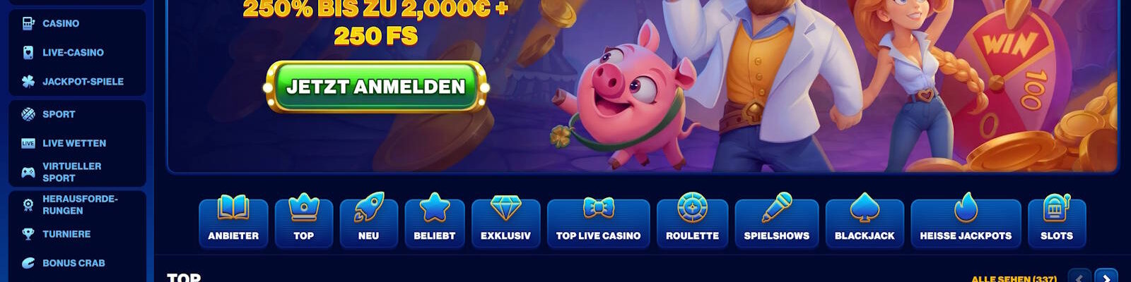 250% Bonus bis 2000 € + 250 FS + 1 Bonus Crab